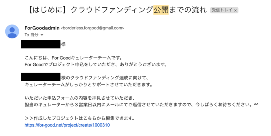 申込フォームで入力したメールアドレス宛に「クラウドファンディング公開までの流れ」が届きますので、メール本文中のリンクにアクセスしましょう。