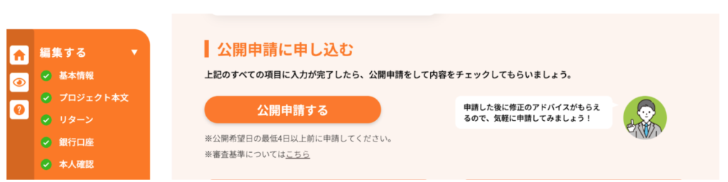 プロジェクトページが完了したら、公開前の審査を依頼する「公開申請」を行います。