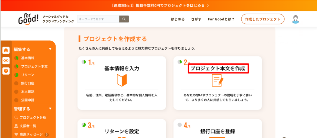 3.「プロジェクト本文を作成」をクリックし、作成画面に移動します