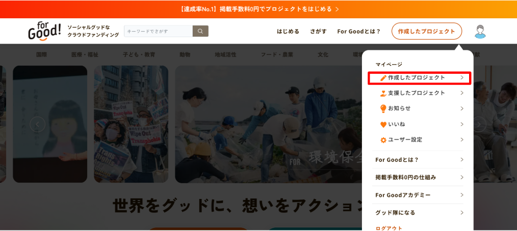 画面右上の「マイページ」から「作成したプロジェクト」をクリックし、続いて編集したいプロジェクトの「編集する」ボタンをクリックします。