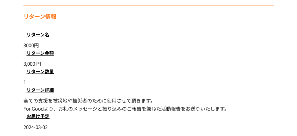 1.まずはリターンの「お届け予定」と決済時にご登録いただいたメールアドレスにお届けした応援完了メールの「お届け先情報」をご確認ください。
